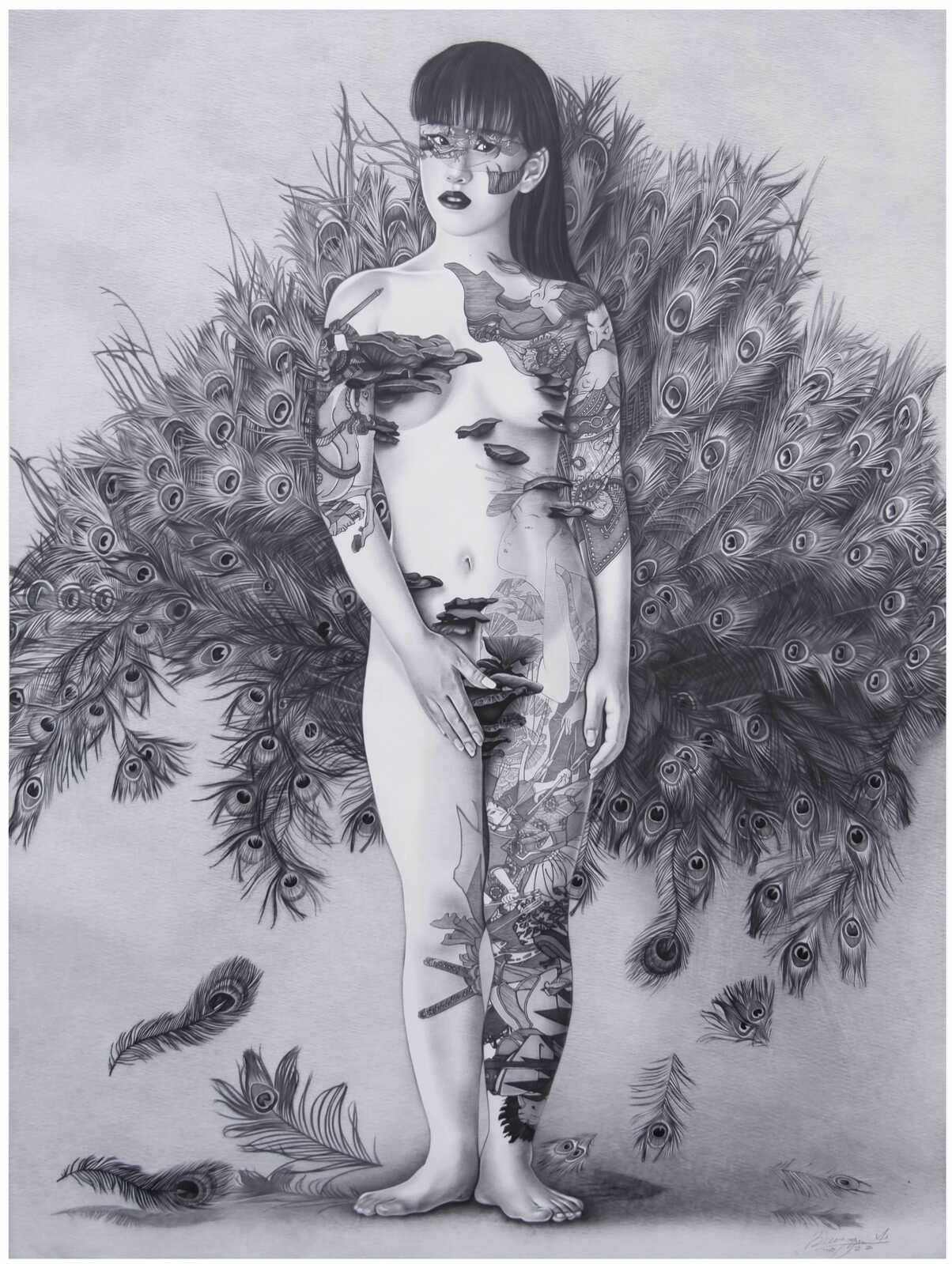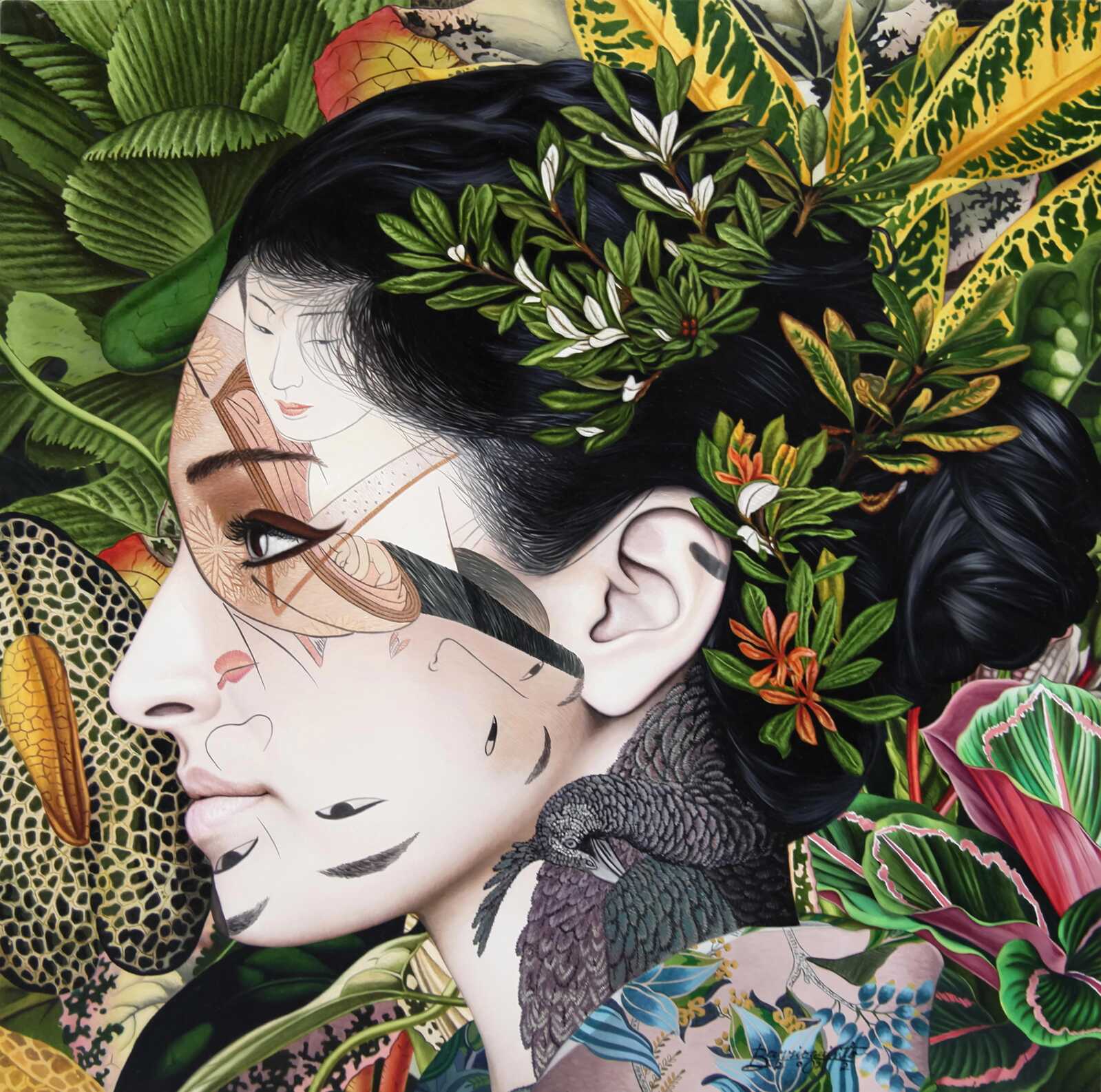 In more recent years, Barrioquinto’s works have developed a distinctive style of surreal and hyperrealistic portraits. With fine strokes in acrylic and oil, the artist renders recognizable faces in subdued tones. The dark tone in his old style still creeps into his newer works, although masked by the calmness of flowers, birds, butterflies, and traditional patterns belonging to Japanese culture – specifically ukiyo-e, Japanese woodblock prints from the Edo period.