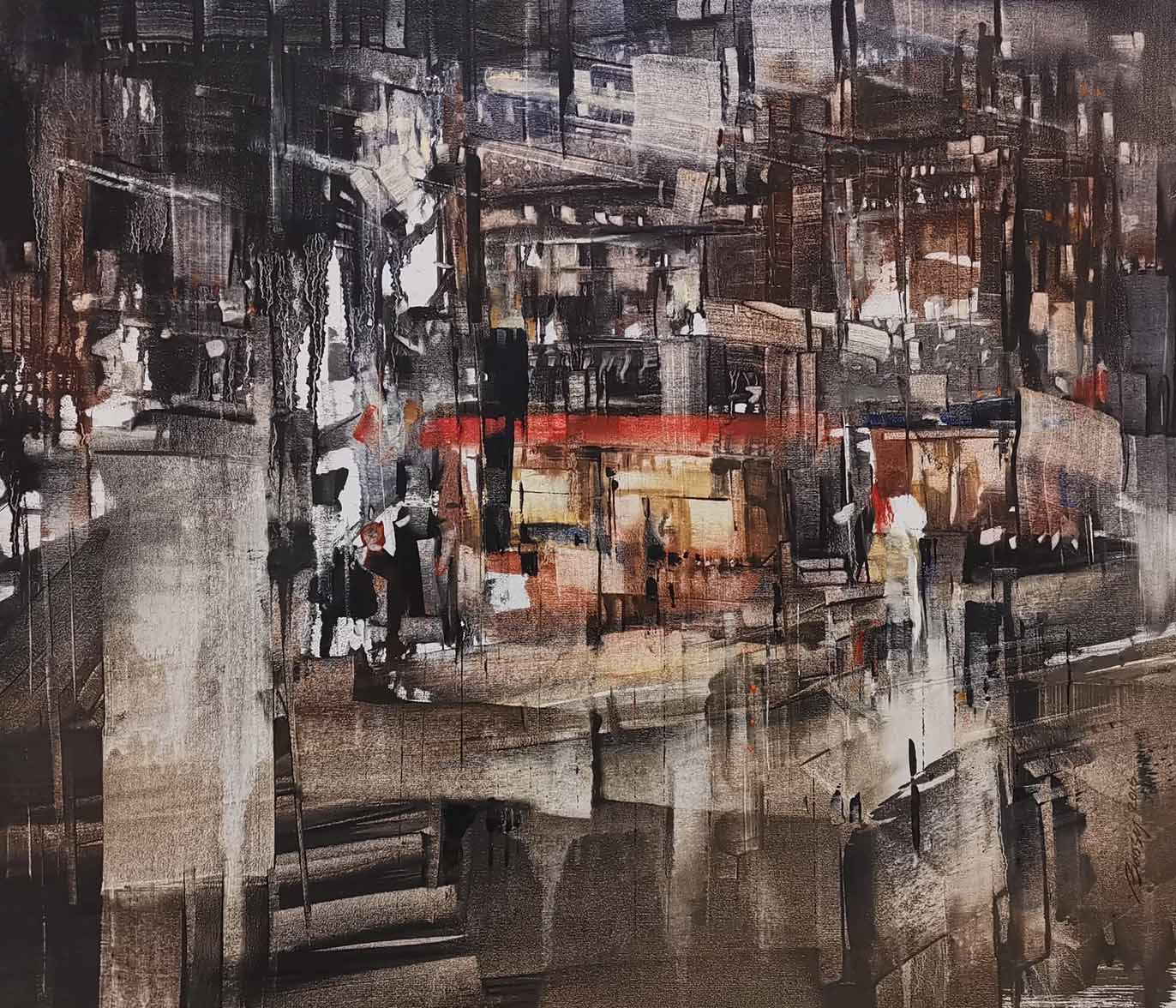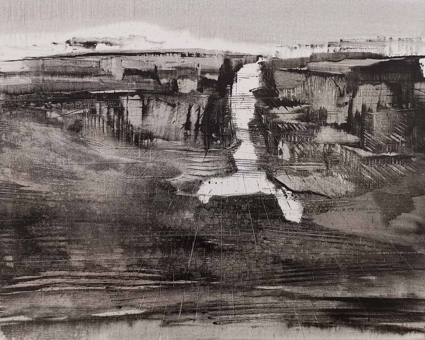 His recent series of paintings conjure a natural world gradually dissected and displaced by urban development. The monochromatic handling of linear structures resembling scaffoldings, partitions and platforms are created through the delicate process of pulling and pushing wet paints across the canvas using a squeegee. These imageries do not evoke real moments of memories but refer to a special, in-between zone of the real space and the utopia; a baffling place where reality and fantasy coexist.