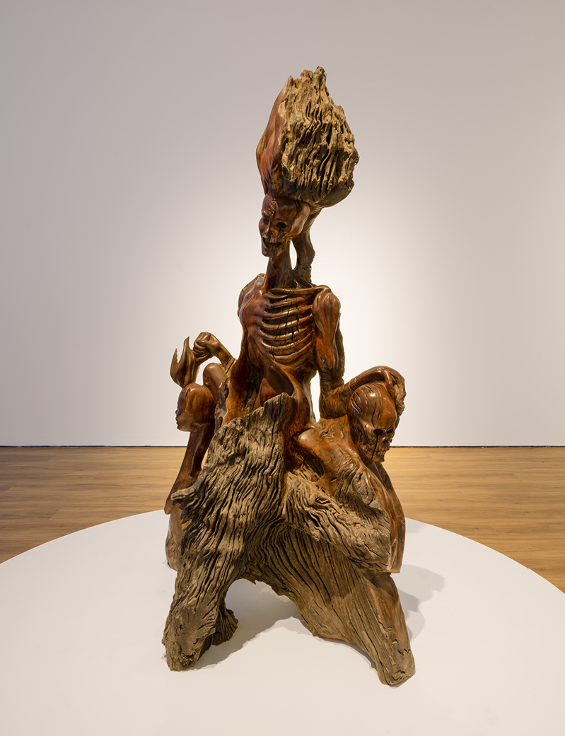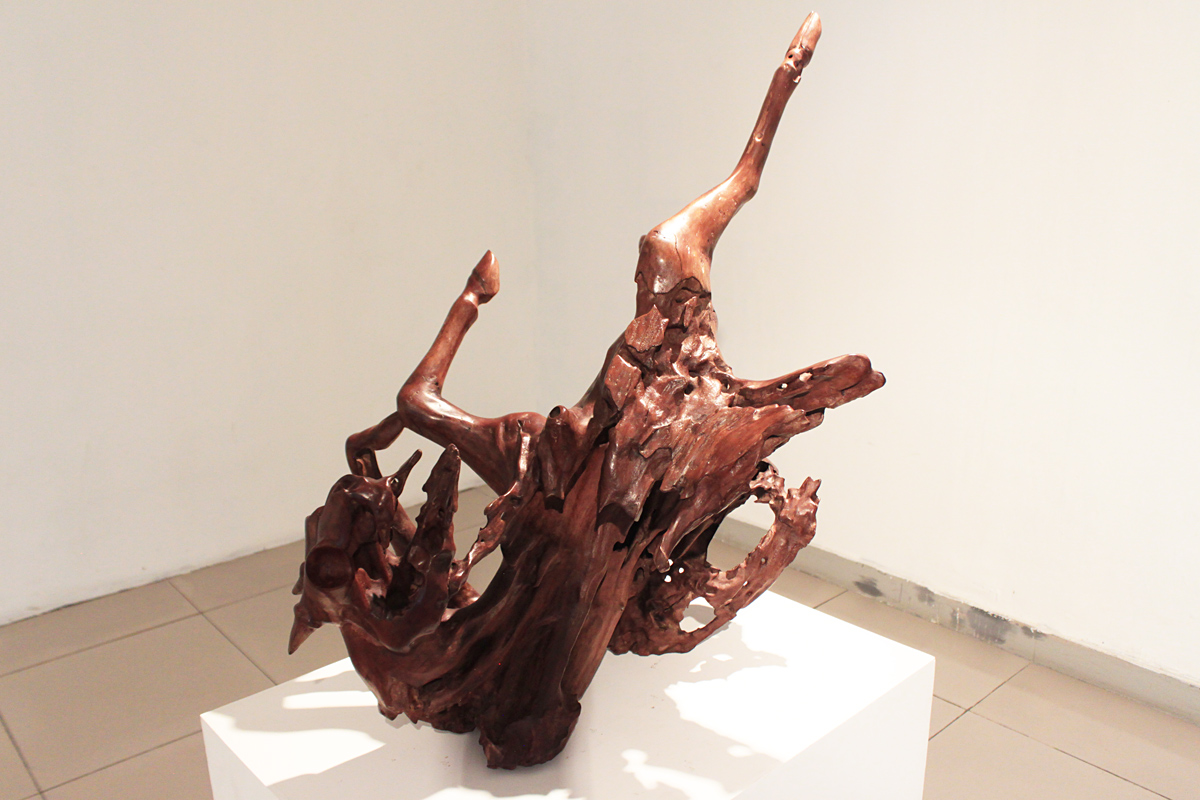 Ketut Muja was an artist who primarily worked in sculpture. His well-renowned sculptures are carved of old wood roots into surreal and mystical shapes, and his works have been collected by collectors from within and outside the country. Before turning to sculpture, Muja learned to make masks from Wayan Tangguh when he was 13 years old. Muja then studied sculpting realist and naturalist statues from Made Rondin and Wayan Kompit. In this era, he also made statues about the Ramayana and Mahabarata stories. His most prominent work is the Hanuman statue.
