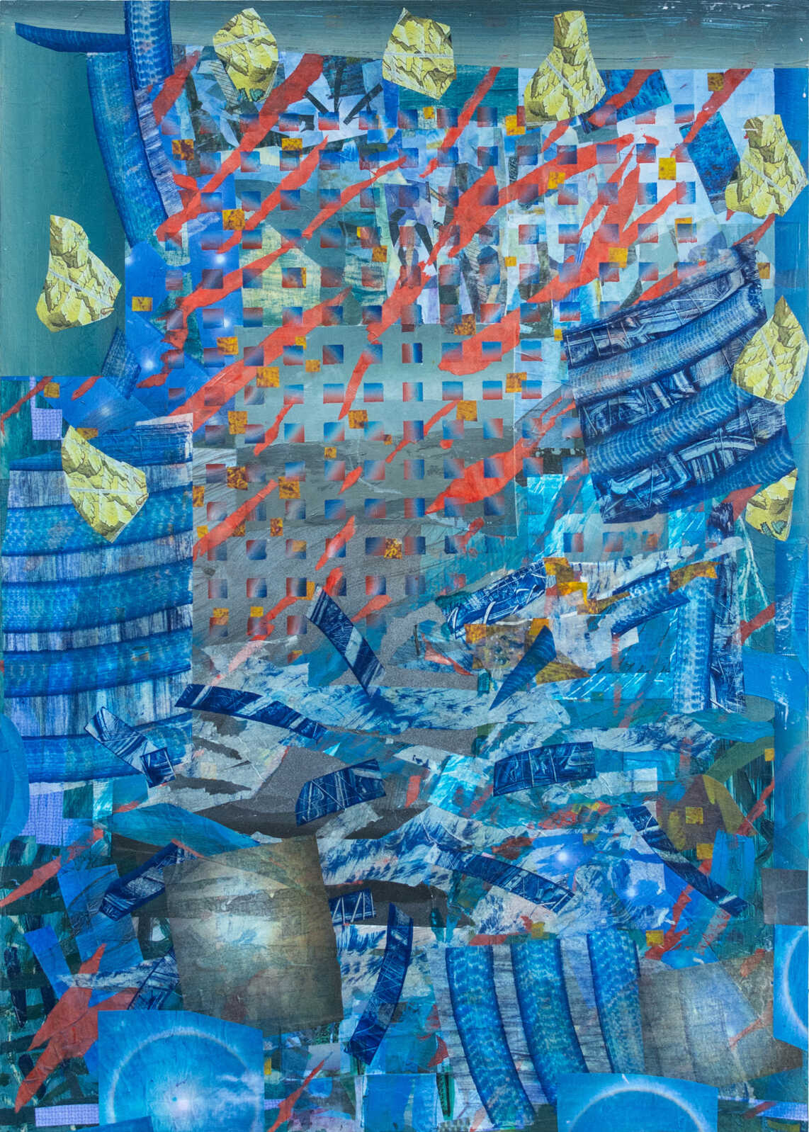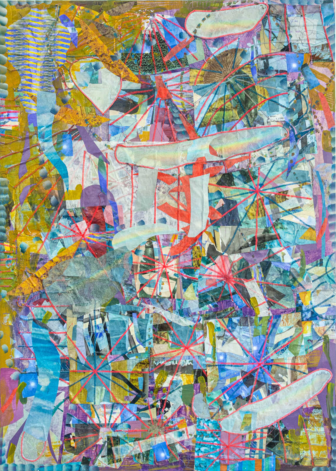 Ivan David Ng, 'Celestial Signs for Wondering', 2022, digital print, thread, monotype mulberry paper, acrylic, handmade paper, PVA and varnish on wood, 140 x 100 cm. Image from Artsy