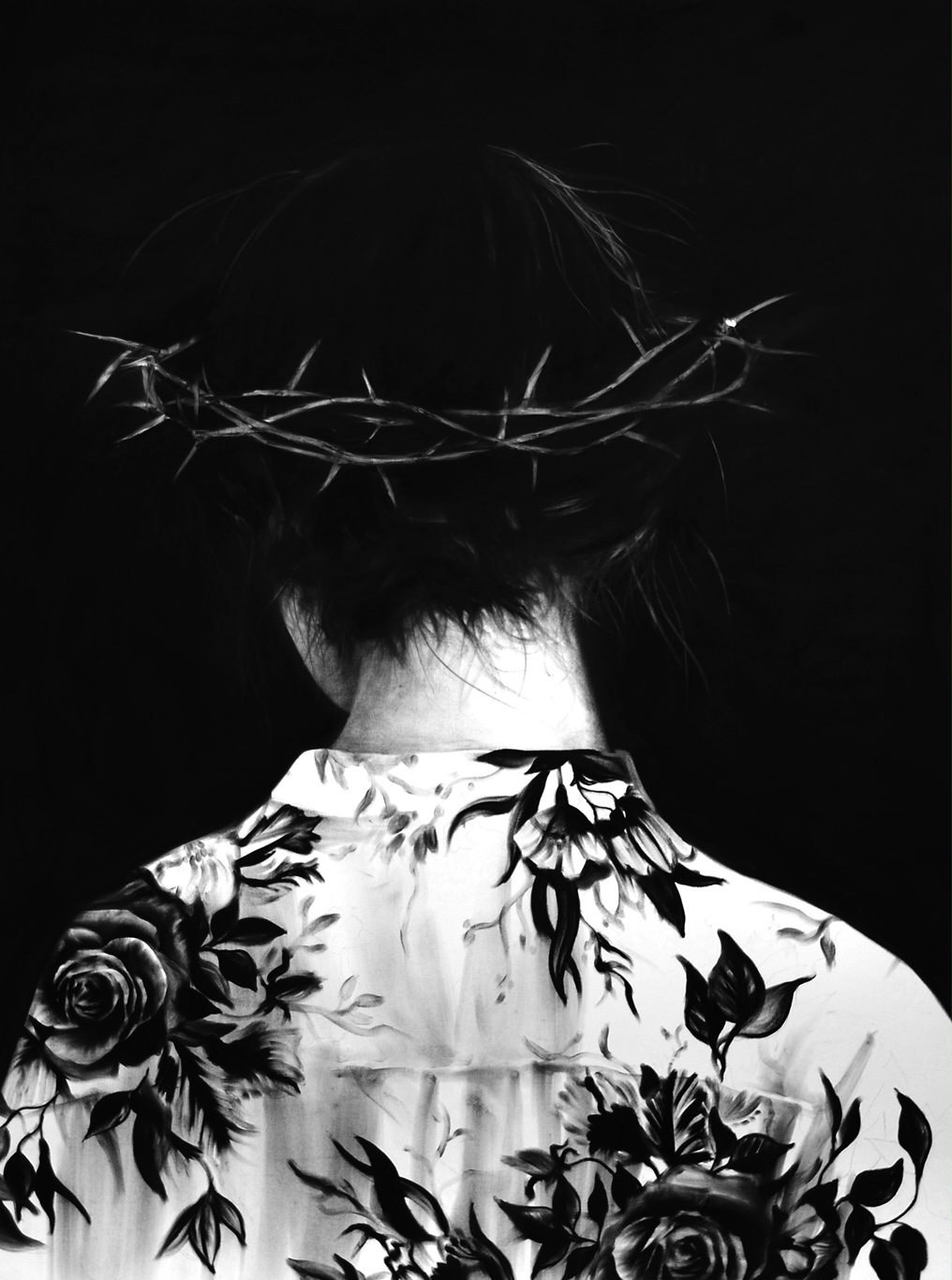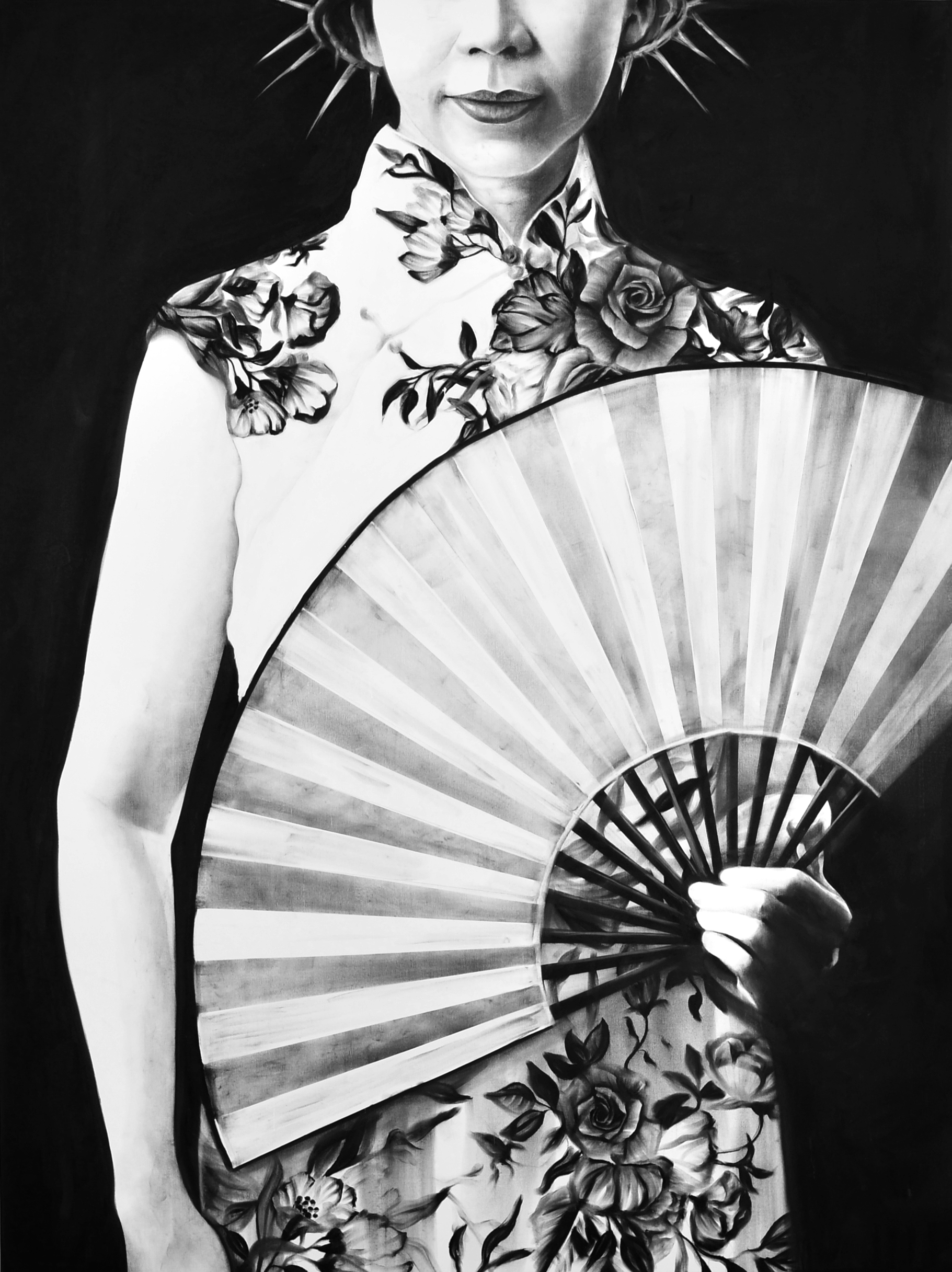Trained as a printmaker, Pramuhendra’s transition to dry media, particularly charcoal pencil on paper or canvas, has resulted in intense, meticulous and rich greyscale images. Whether working with drawings, installations or photography, he maintains a commitment to black and white aesthetics. His use of chiaroscuro becomes a metaphorical exploration, where light symbolises the divine presence.
