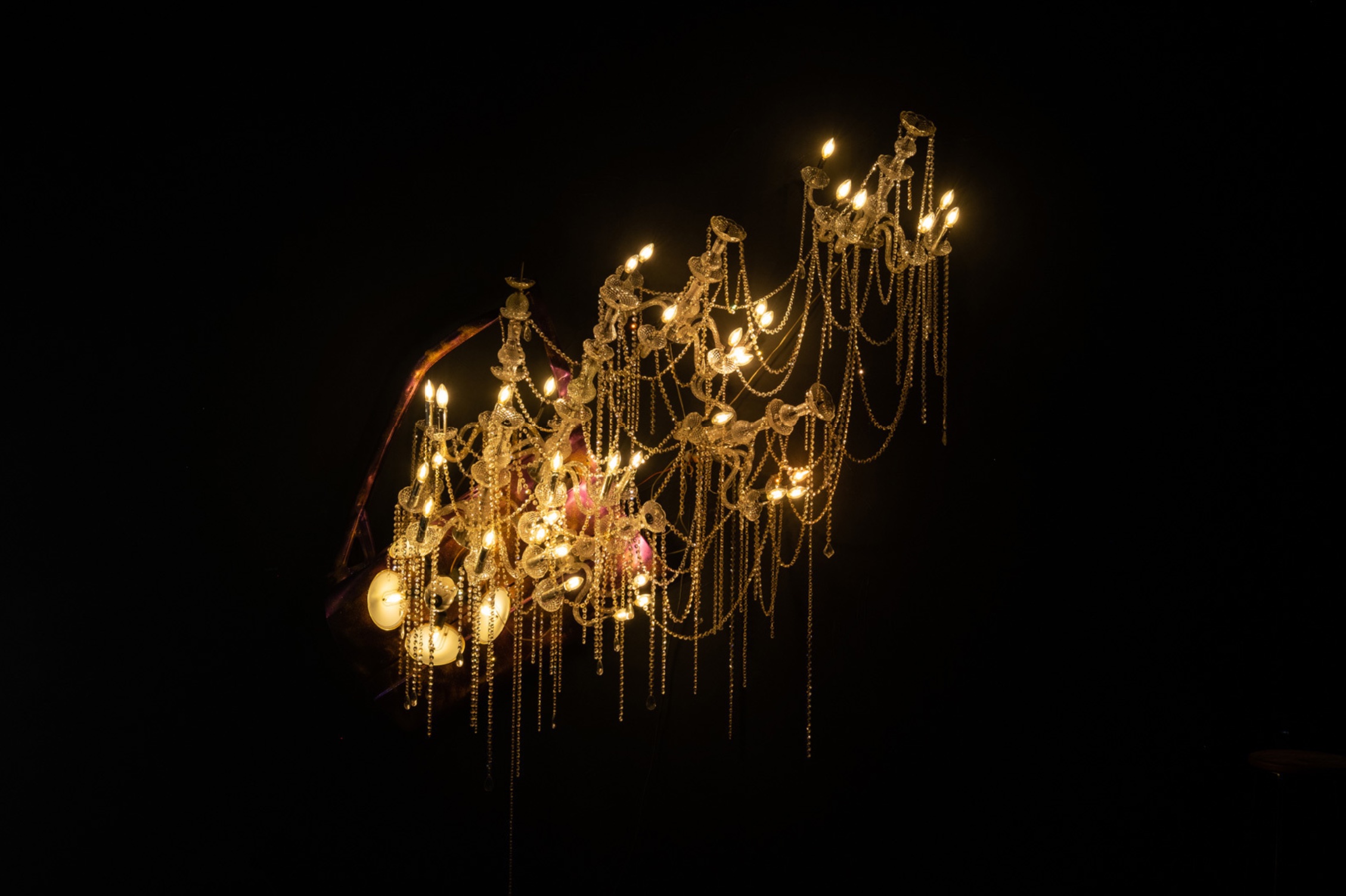 Jompet Kuswidananto, ‘Love is a Many Splendored Thing #8’, 2023, car door, glass chandeliers, 200 x 70 x 200 cm. Image from Artsy