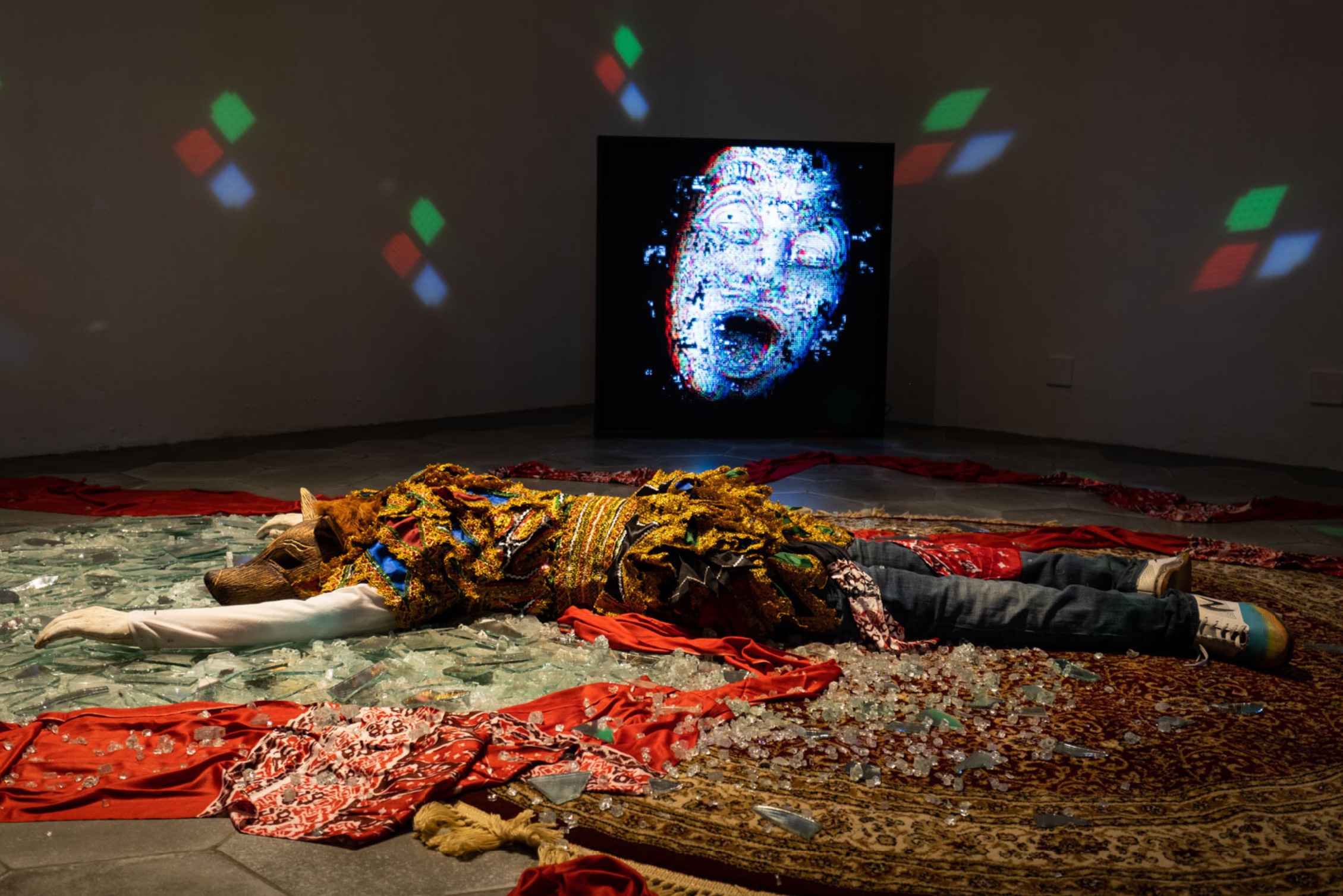 Jompet Kuswidananto, ‘Subterranean Thunder #1’, 2023, fabrics, resin, wood, iron structured mannequin, broken glass, 50 x 500 x 350 cm. Image from Artsy