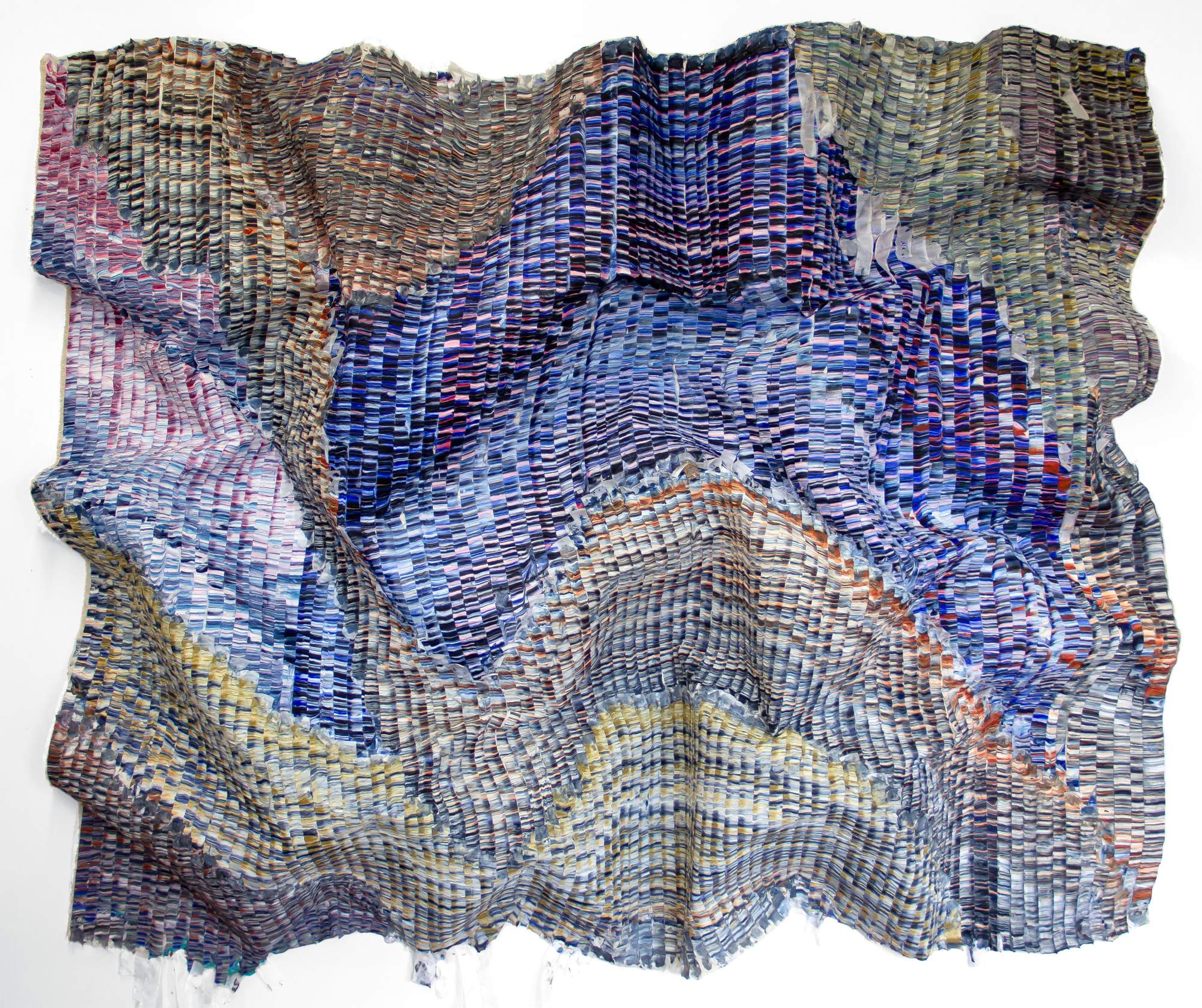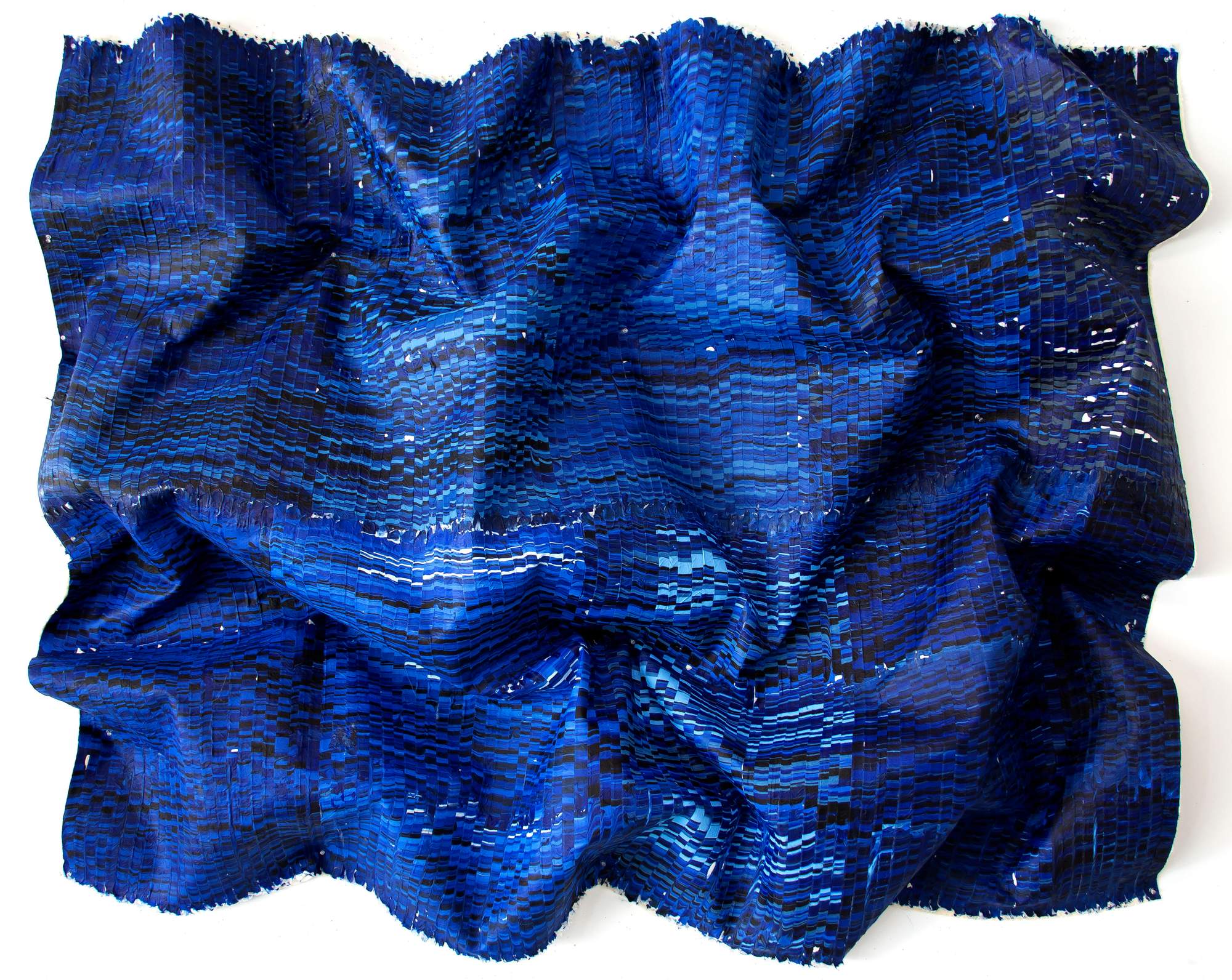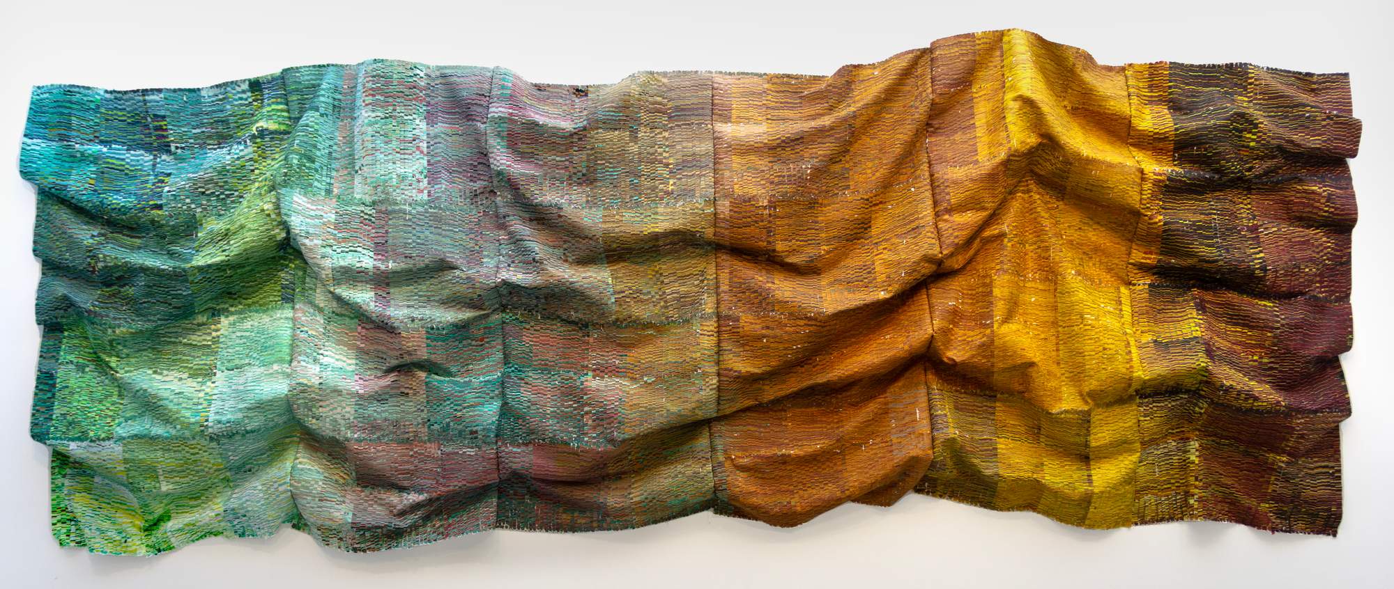 Kenny Nguyen creates ‘deconstructed paintings’; large, bold works that are composed of hundreds of silk strips, which he cuts, paints, and meticulously applies onto canvas. The pieces may be hung in different iterations: sculpturally on the wall with undulations or flat, stretched like a painting on bars or behind glass. Kenny moved to the United States in 2010 From Vietnam. After art school, he spent his early career in fashion. Working with silk has ties for the artist not only to dressmaking and patterns, but also long-standing associations to the material through his culture. The idea of cutting a fabric revered for its symbol of wealth, its beauty and delicacy in clothing, and its century-long ties to trade and status in Asia was a breakthrough for Nguyen. By taking something from tradition and reconstructing it, he was maintaining an association with his past while also making it his own. The process itself, like the artist himself, is a hybrid. Blending cultures and ideas, illustrating how identity is constantly changing over time, creating beauty and versatility.