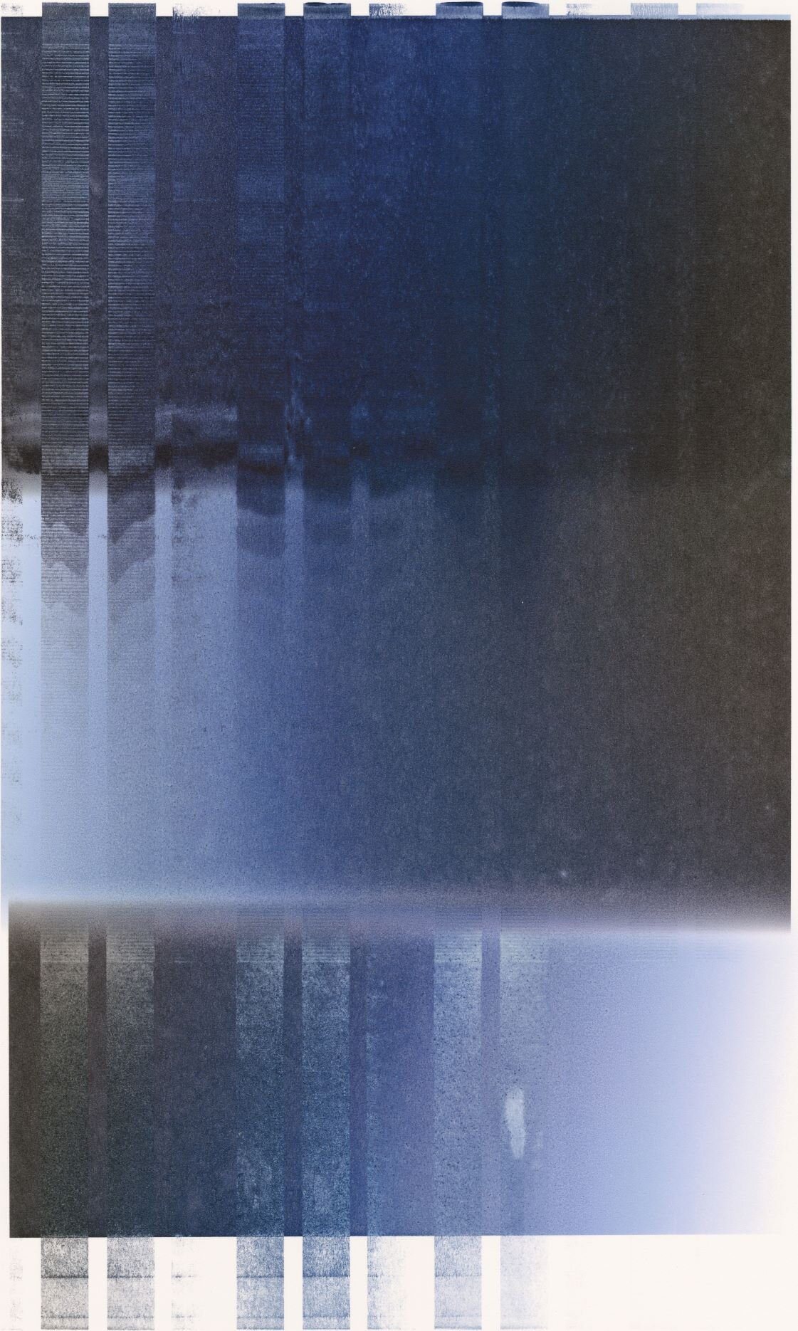 Eschewing photography’s documentational nature and its propensity to ‘capture’ or freeze a moment in time, Liu’s images are often built up from repetition and layering, a practice that deliberately prolongs the process of image-making. In doing so, the original image is effaced, resulting in evocative planes of colour that recall landscapes or shifting light. In another trajectory of her practice, a new image is created from close-up crops of an original, larger image. ‘Periwinkle’, for instance, started off as a photograph of the moon in a twilight sky, with a dark shadow at the edge of the frame. This accidental detail became the building block of the new work, repeated several times over to create a new, abstracted image, emitting its own gentle pulse.