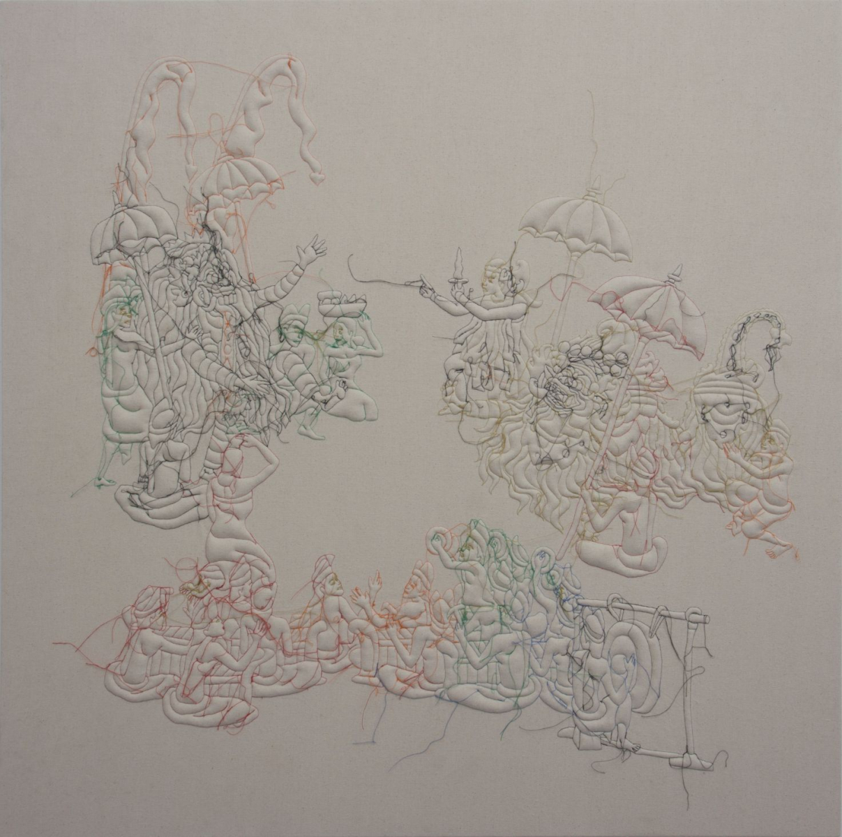 Made Wiguna Valasara, 'DAILY PARADE', 2020, hand stitched embossed canvas, 100 x 100 x 5 cm. Image from Sovereign Art Foundation