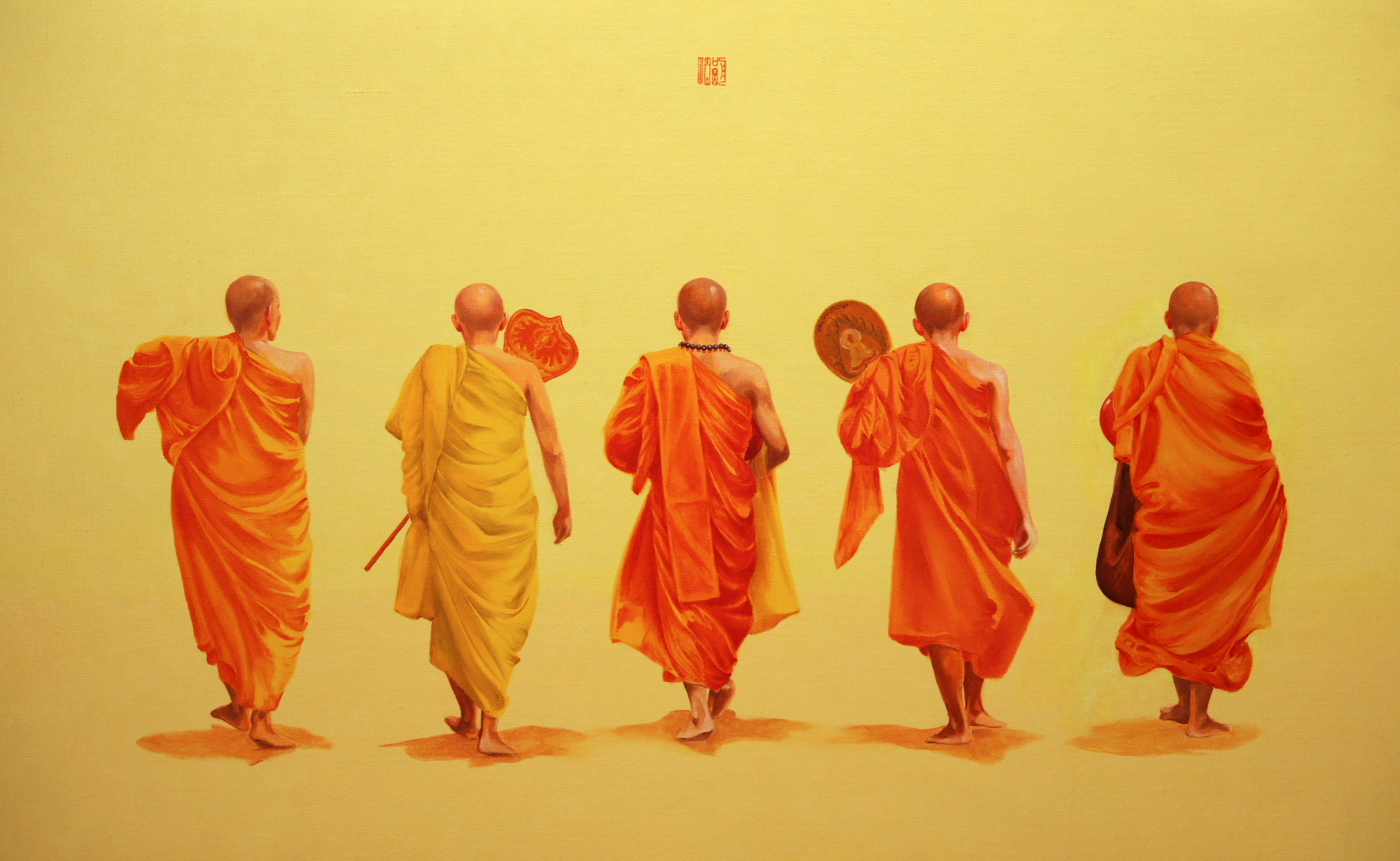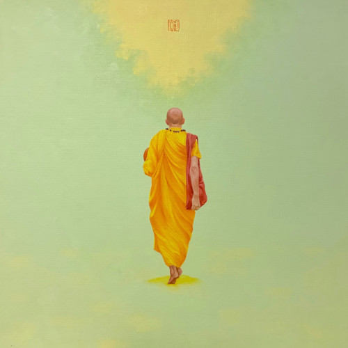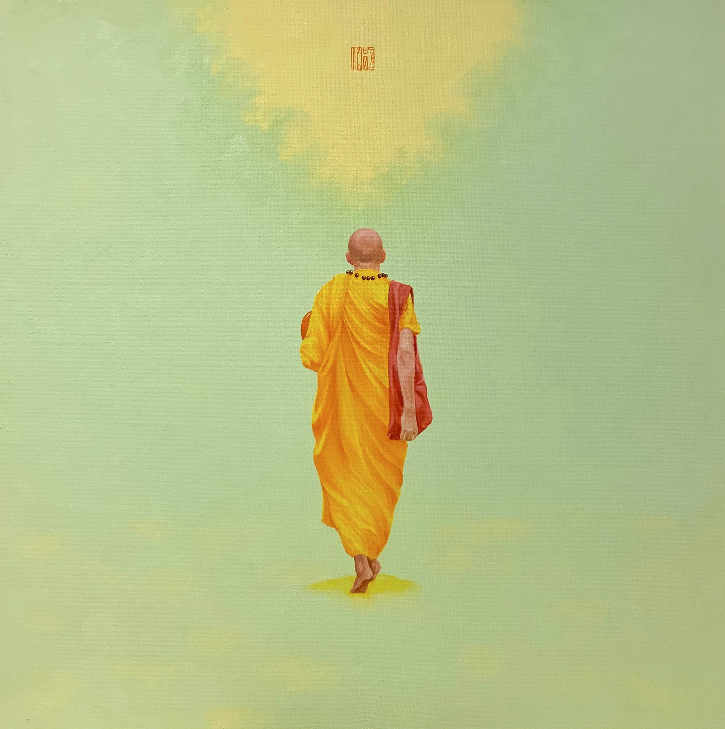 As an artist, Nguyen Minh Phuoc strives to use his skills to send messages, not simply to create beauty. He is well known within Vietnam for introducing the concept of artistic installations and performance art. Many of Phuoc’s paintings focus on the iconic image of a monk or a group of monks, viewed from the back, travelling in a purposeful journey.