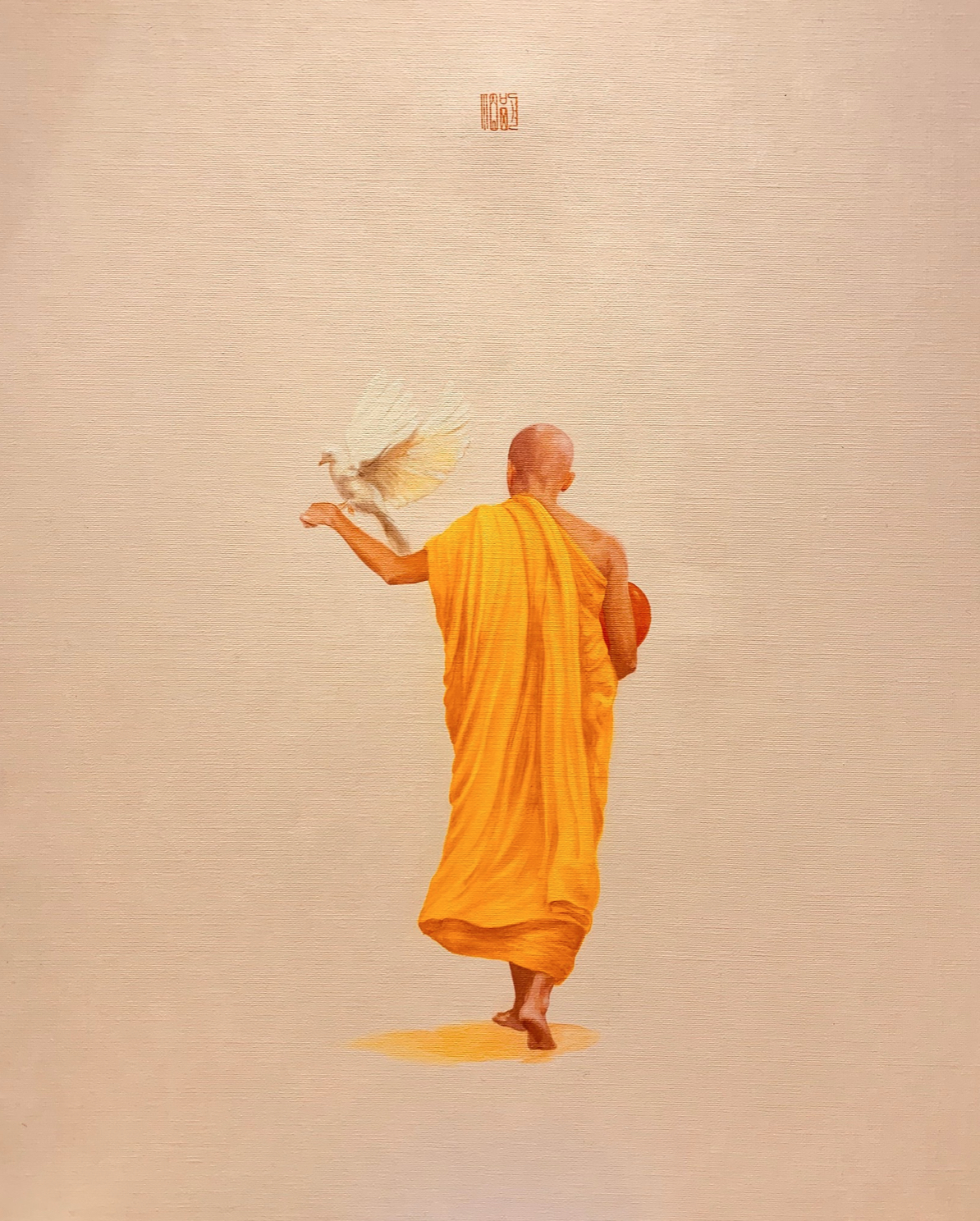 The backgrounds of his works vary, from pagodas, temples, tree-tops, and even simply a deep hue of reddish-orange. The simplicity and two-dimensionality of the backgrounds serve to contrast the detail of the monks’ robes; as every fold and shade is in sharp focus. An additional distinctive characteristic of Phuoc’s artwork is the detail afforded to human musculature. Each monk is depicted with an effort toward the accuracy of the human form, juxtaposing it with the slightly ethereal aura and spirituality his pieces exhibit.