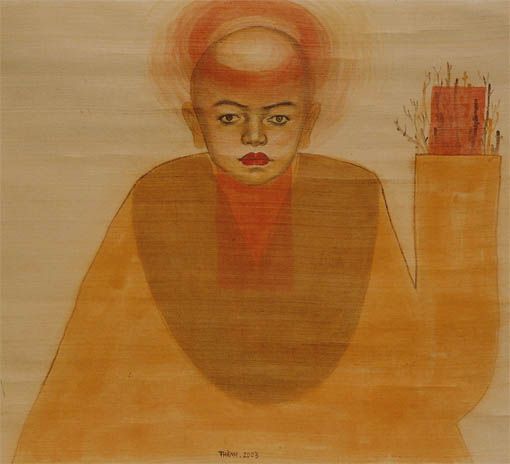 Nguyen Minh Thanh graduated from Vietnam University of Fine Arts. He was one of the first Hanoi artists to display their work internationally, and he has since significantly influenced the subsequent development of contemporary art in Hanoi, Vietnam. Nguyen Minh Thanh’s work, mainly Chinese ink and watercolor on handmade Vietnamese Dó paper, is marked by his use of what appears to be his own portrait in meditative and spiritual explorations.