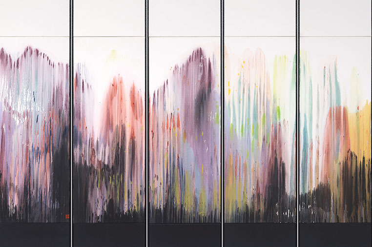 Yeoh Choo Kuan, ‘Spring Vista’, 2020, acrylic on linen 200x250cm each panel 200x50cm flattened. Photo courtesy RKFA and the artist.