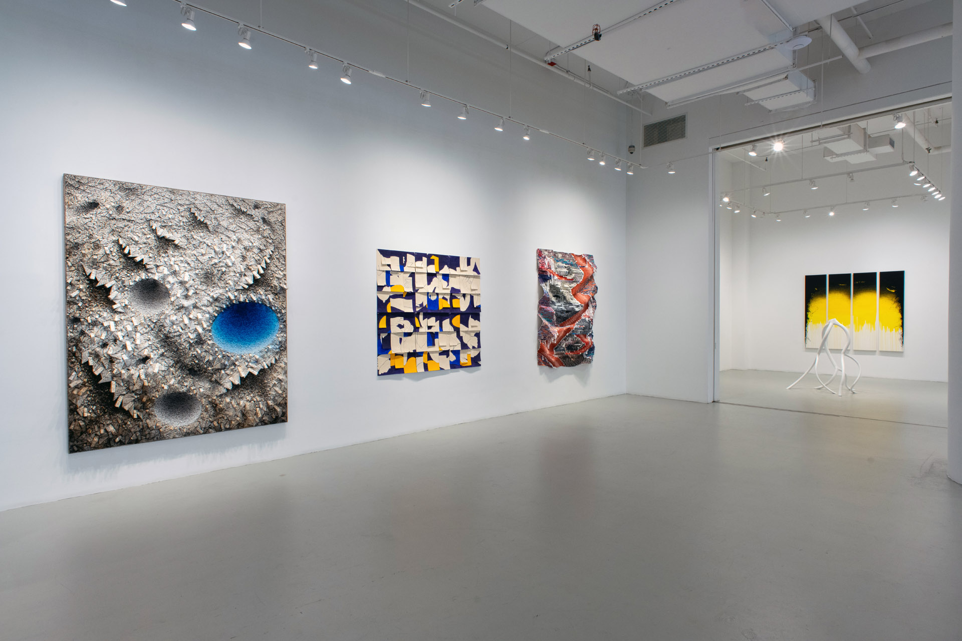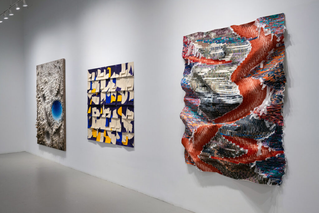 Installation view of ’25th Anniversary Exhibition’ at Sundaram Tagore New York. Work featured (left to right): Chun Kwang Young, ‘Aggregation 23 – SE112’, 2023; Susan Weil, ‘Configurations – Blue and Orange’, 2000; Kenny Nguyen ‘Eruption Series No. 43’, 2024. Images courtesy of featured artists and Sundaram Tagore Gallery