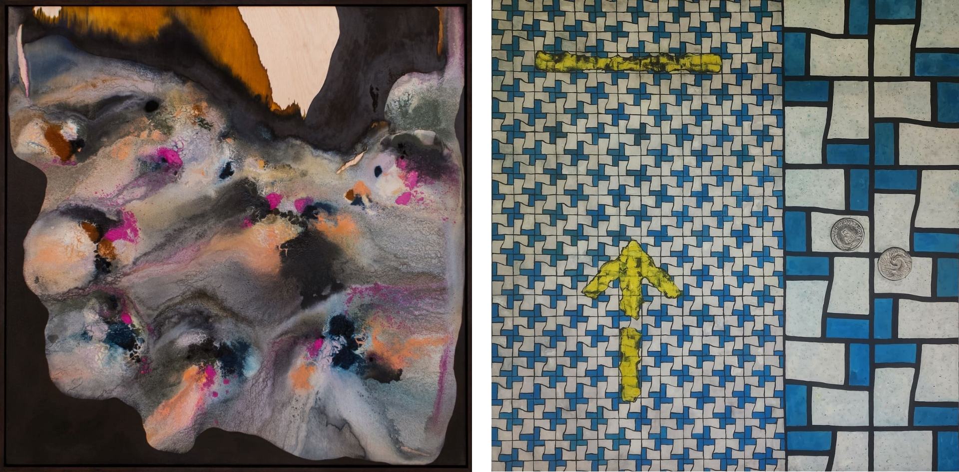 Photo (Left): Dawn Ng, ‘Volcano Blossoms’, 2024, acrylic paint, dye, and ink on wood, 123 x 123 cm. Image courtesy of the artist and Sovereign Asian Art Prize