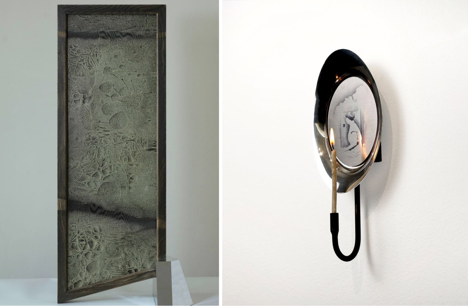 Photo (Right): Pam Virada, ‘Early Spring’, 2024, V print on stainless steel, found tray, metal, candle, 25.5 x 10.5 x 5.5 cm. Image courtesy of the artist and Sovereign Asian Art Prize