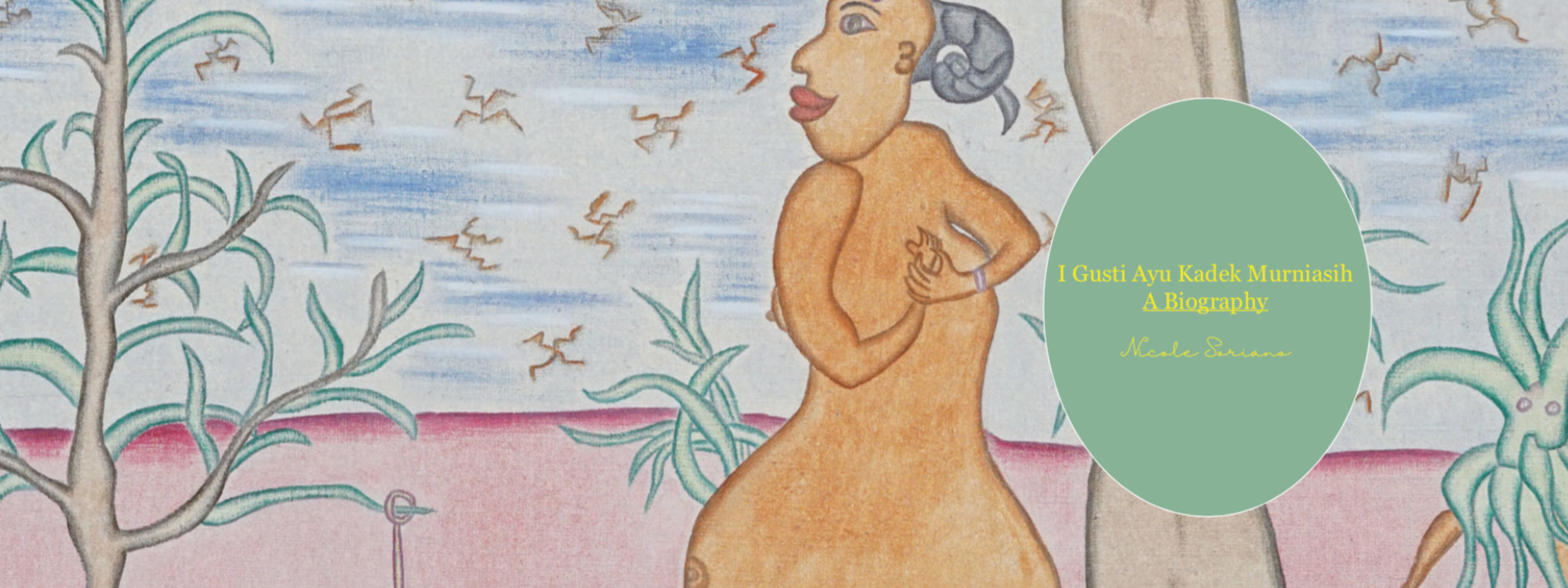 One year after she finalised her divorce in 1993, I Gusti Ayu Kadek Murniasih, then a 28-year old budding Balinese artist, painted ‘Menanti Kedatangan Bapak’ (Waiting for Daddy to Come). Washed in soft, pastel colours, the work depicts the body of a slender woman languidly lying down, holding a flower in her left hand. Save for a gold necklace, a pink cloth partially covering her stomach, and a thin watch wrapped around her right arm, the woman is naked. The title and the woman’s position reveal a sense of anticipation—capturing a longing so honest and pure, it almost feels childlike.